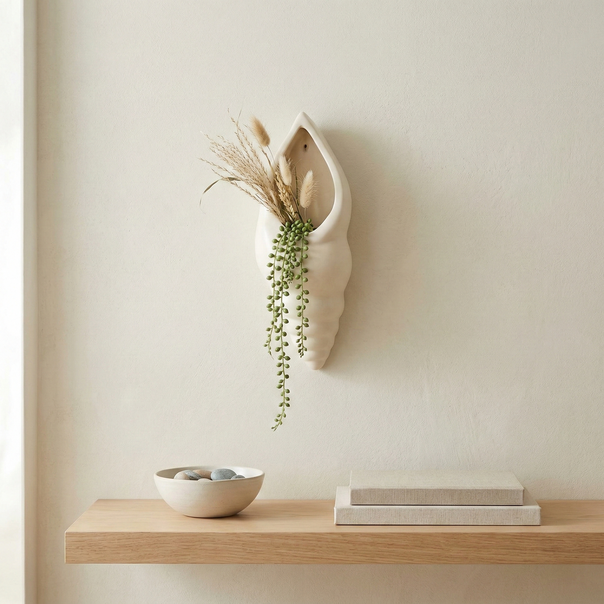 Hang it by your entryway, balcony, bathroom or living room wall and style it with trailing plants, small succulents or faux stems to create a calm, beach‑inspired nook. Its neutral off‑white finish blends effortlessly with most colour palettes, making it a versatile accent for modern, minimal and boho homes.