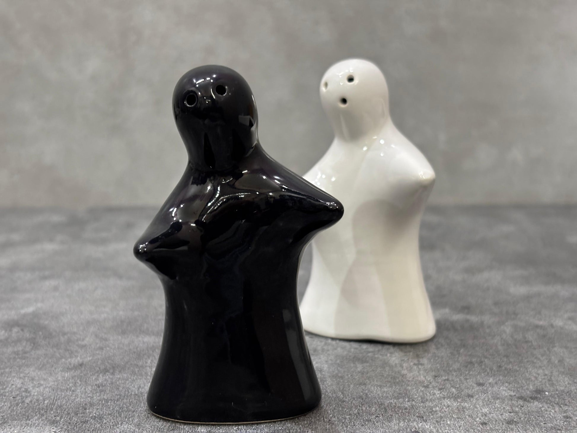 Crafted from ultra-glossy ceramic in a classic monochrome palette, these little guys feature a fluid, ghost-like design that makes them look like they are mid-dance or going in for a cozy embrace. Whether you're serving up a romantic dinner, hosting a spooky-season movie night, or just love a minimalist-with-a-twist aesthetic, this black-and-white pair proves that salt and pepper are truly soulmates.